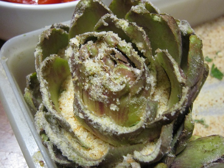 2. Open up the leaves of the artichokes with your hands and sprinkle the breadcrumb mixture over them, making sure you get plenty between the leaves. Place the artichokes in a snug pan with high sides.
