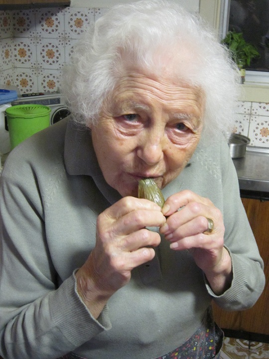 Nonna is showing me how to make artichokes – carciofi –  the way she has always made them, with breadcrumbs, parsley, garlic and not much else. Nothing, well nearly nothing, gets cut off and thrown away.